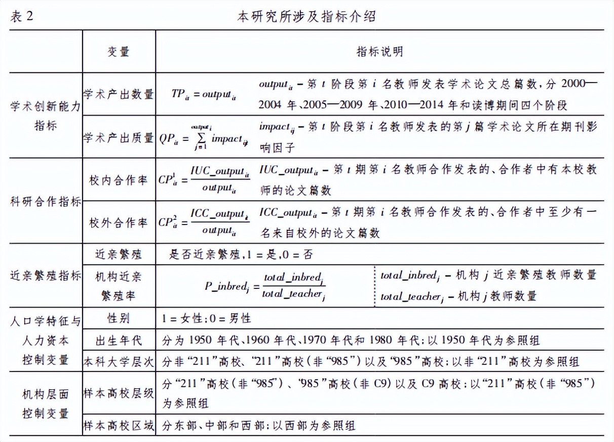本文尝试基于社会资本理论解释近亲繁殖对教师学术创新能力影响的内在机制。在已有文献中,一些学者用相关人员的互动行为反映“已动用”的社会资本(Lin&Dumin,1986),或者直接用合作行为测量了学术社会资本(Abramo et al.,2009;Bozeman et al.,2013;梁文艳和周晔馨,2016)。本文基于相关文献从已动用社会资本的角度,通过科研合作行为度量社会资本,即利用学术发表署名信息获得校内合作率和校外合作率两项指标(见表2),分别衡量了教师基于机构内强关系以及基于跨越机构边界弱关系所拥有的社会资本。尽管“搭便车'、“荣誉作者”(Honor author)等问题可能干扰利用署名信息测量合作的准确性,但署名信息在很大程度上刻画了学术成果完成过程中关键的参与者,并且文献计量数据相对易得,已有研究大多利用文献计量法从论文署名信息中提取合作信息。